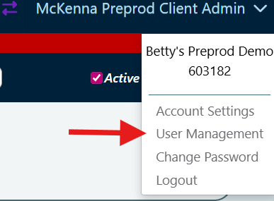 - You can now access User Management by clicking the dropdown menu under your username in the top right corner of the PantrySoft Admin screen.